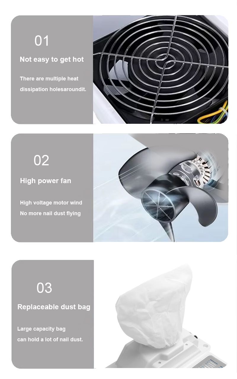 उत्पाद नाखून मलबे के मजबूत सोखने से धूल का रिसाव नहीं होता है, काउंटरटॉप को साफ सुथरा रखें, तेज वैक्यूमिंग से धूल का रिसाव नहीं होता है, उच्च शक्ति अधिक कुशल होती है।