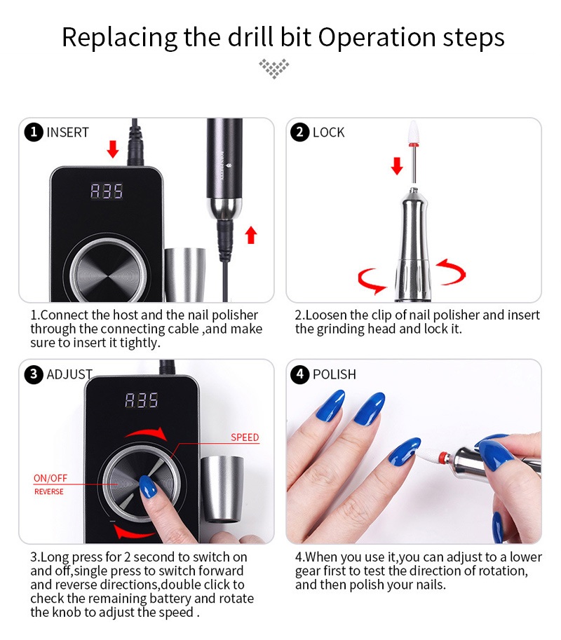 यह एक्सफ़ोलीएटिंग 35,000 आरपीएम इलेक्ट्रिक नेल ड्रिल रिप्लेसमेंट ड्रिल ऑपरेशन विधि, यानी प्लग एंड पुल आउट, आसान और सुविधाजनक, प्रतिस्थापन पूरा होने के बाद इस्तेमाल किया जा सकता है।