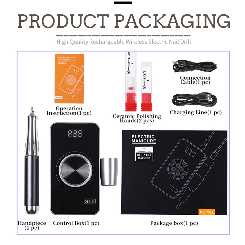 इस एक्सफ़ोलीएटिंग 35,000 आरपीएम इलेक्ट्रिक नेल ड्रिल पैकेज की सामग्री में एक सैंडिंग पेन उत्पाद, एक यूएसबी चार्जिंग केबल, एक उत्पाद निर्देश मैनुअल और एक हल्का और पोर्टेबल बॉक्स है।