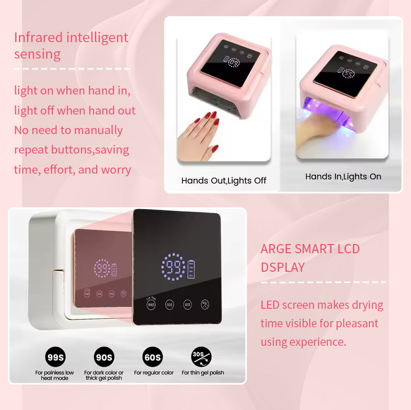 यह उच्च गुणवत्ता वाला जेल नेल पॉलिश त्वरित-सूखा लैंप बिना सिकुड़न के गोंद को समान रूप से सुखाने को सुनिश्चित करता है। इसके दोहरे प्रकाश स्रोत हाथों के मलिनकिरण और आंखों के तनाव को रोकने के लिए हल्का ताप प्रदान करते हैं, जो हाथों और पैरों दोनों के लिए उपयुक्त है, जिससे उल्लेखनीय रूप से तेजी से सूखने वाले परिणाम मिलते हैं।