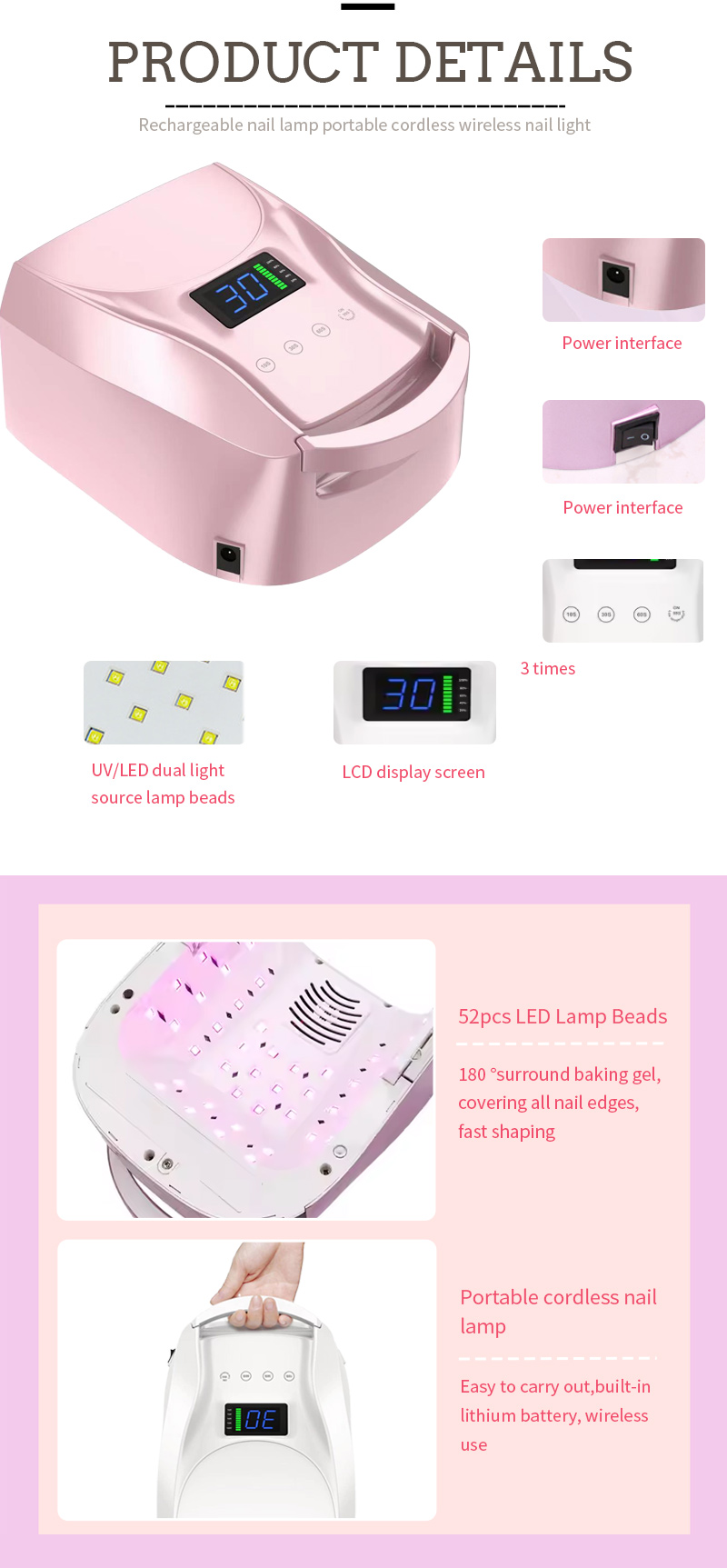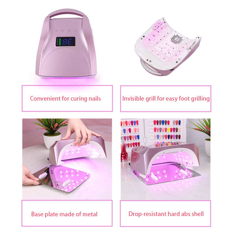 रिचार्जेबल नेल पोलिश लैंप प्रोफेशनल वर्जन 96W प्रोडक्ट उपस्थिति में एक नाली डिजाइन है, खांचे में हैंडल को पोर्टेबल हैंडल भूमिका के रूप में इस्तेमाल किया जा सकता है, जिससे इसे ले जाने और डालने के लिए अधिक सुविधाजनक बनाया जा सकता है। यह संभाल के नुकसान से भी आसानी से टूट जाता है और ढीला हो जाता है।