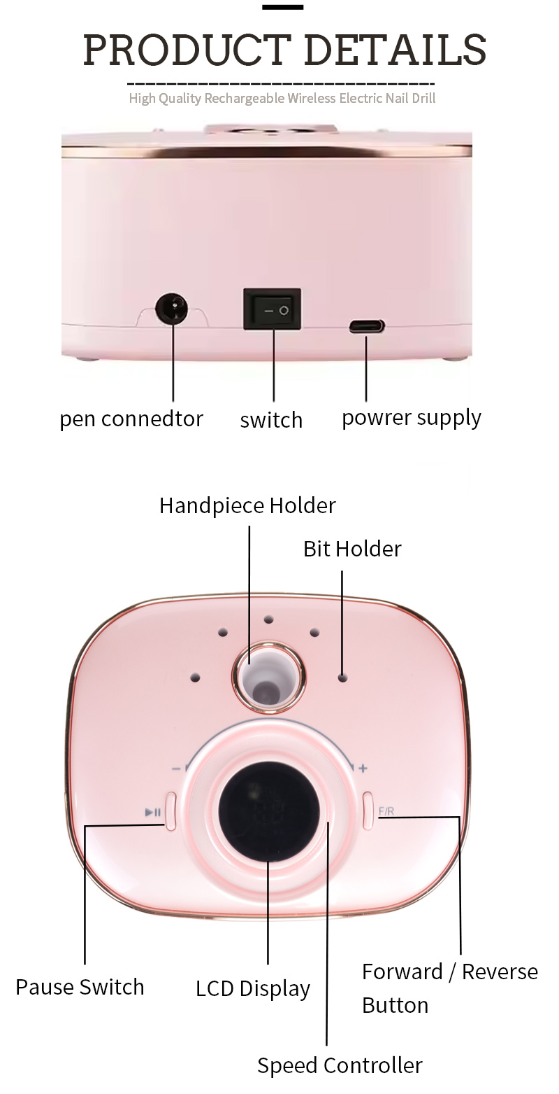 शक्तिशाली हैंडपीस 45w 35000rpm के साथ रिचार्जेबल नेल ड्रिल सेट