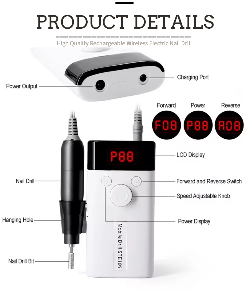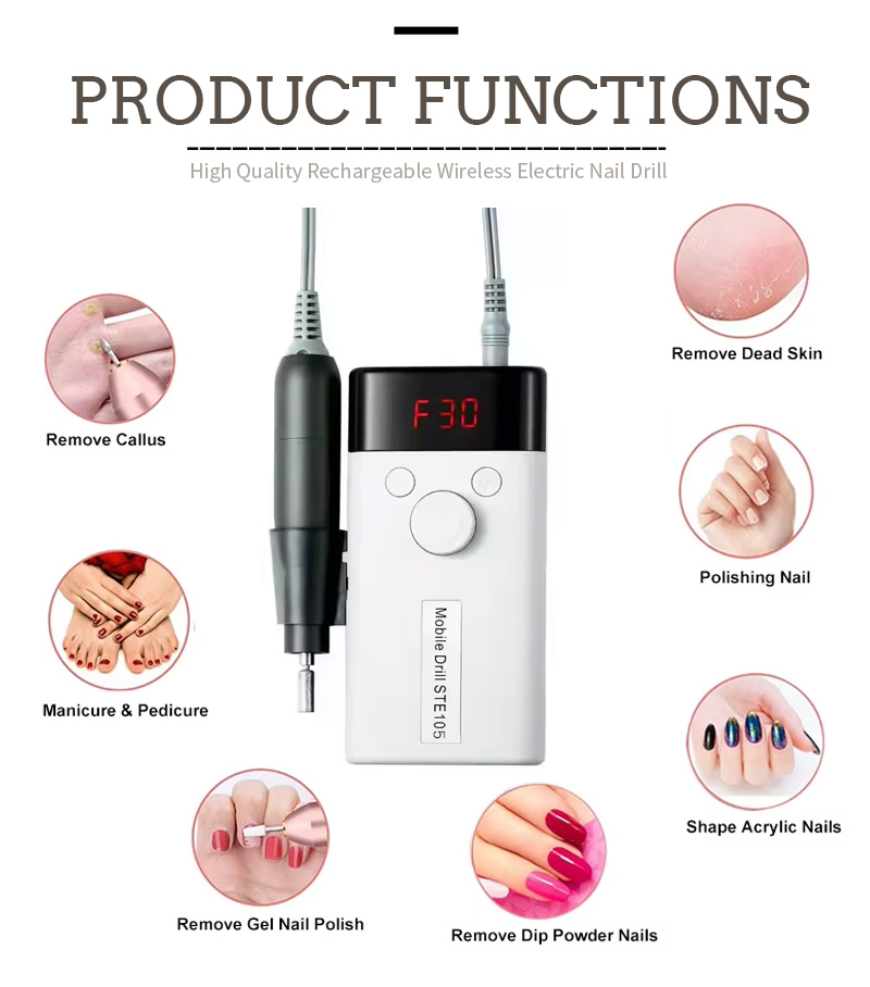 उत्पाद सुविधा और 105 हाई स्पीड 30000 आरपीएम नेल पोलिश रिमूवर इलेक्ट्रिक नेल फाइल का अनुप्रयोग