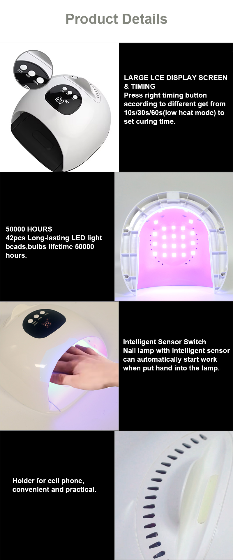 उत्पाद बिना सिकुड़न के गोंद को समान रूप से सुखाना सुनिश्चित करता है। इसके दोहरे प्रकाश स्रोत हाथों के मलिनकिरण और आंखों के तनाव को रोकने के लिए हल्का ताप प्रदान करते हैं, जो हाथों और पैरों दोनों के लिए उपयुक्त है, जिससे उल्लेखनीय रूप से तेजी से सूखने वाले परिणाम मिलते हैं।