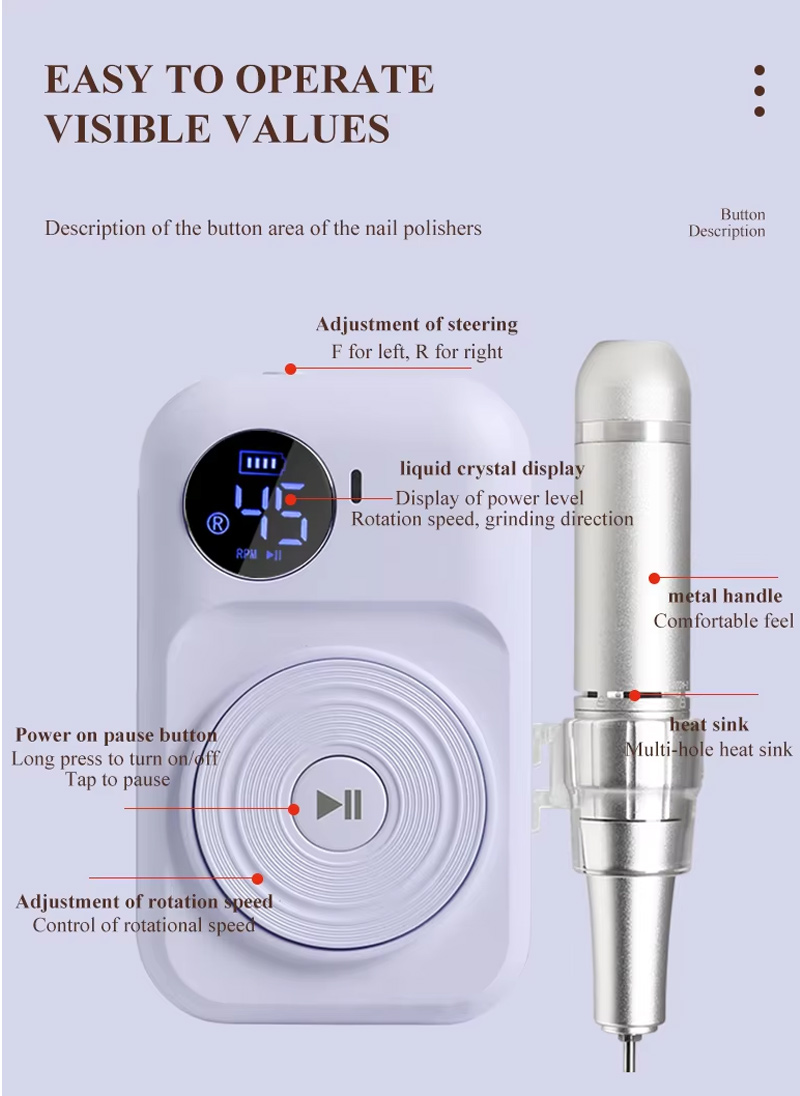 यह प्रीमियम कम शोर वाला ग्राइंडिंग पेन डिस्प्ले डिज़ाइन, सैंडिंग पेन सॉकेट के साथ, एलसीडी लिक्विड क्रिस्टल डिस्प्ले क्रांतियों/शक्ति/दिशा, स्पीड स्विच नॉब, क्लॉकवाइज/काउंटरक्लॉकवाइज टॉगल बटन, पॉज़ बटन, 30,000 आरपीएम पेशेवर मोटर, स्क्रू-इन लॉकिंग ग्राइंडिंग हेड की संख्या दिखा सकता है।