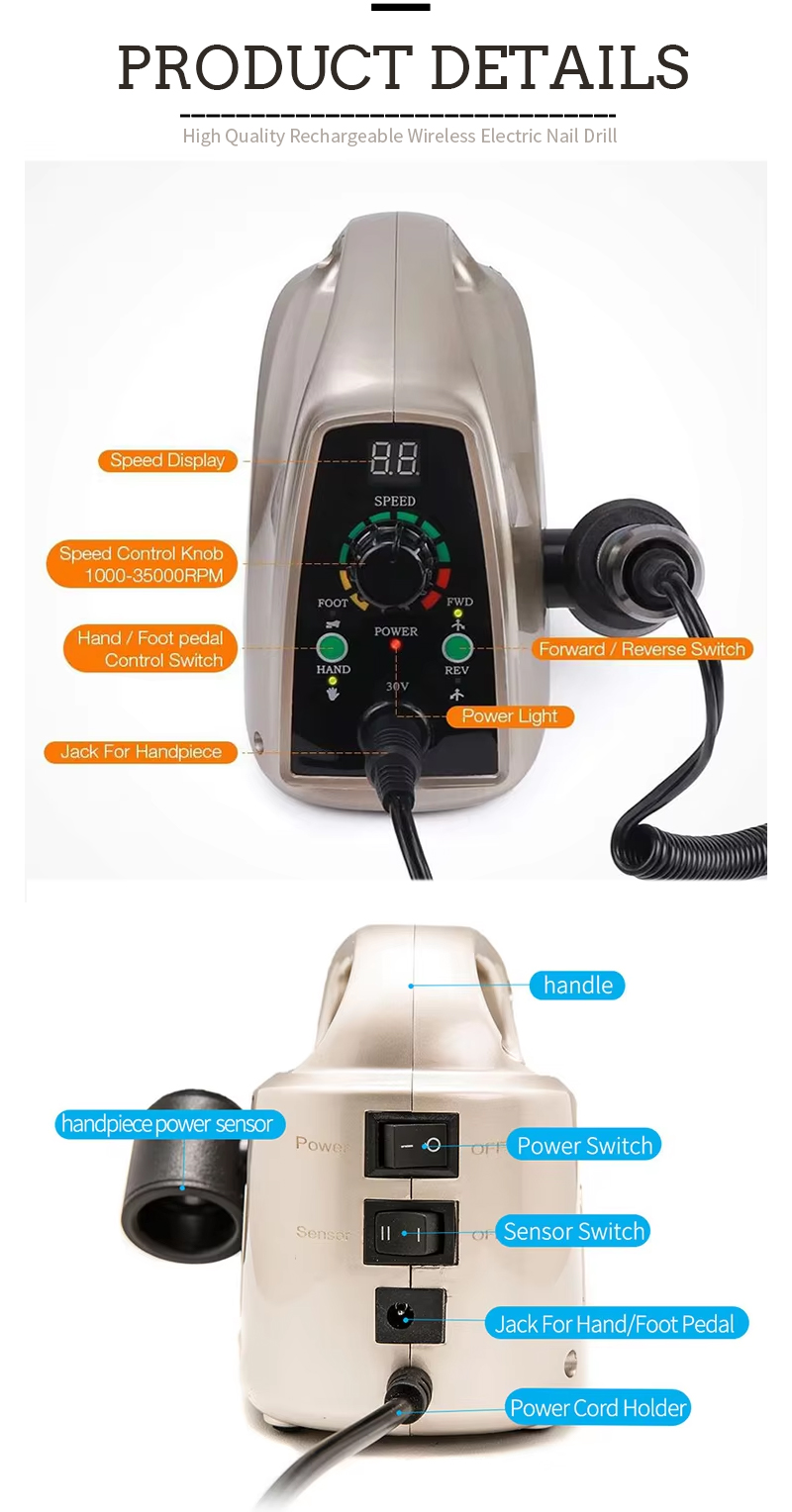 रिचार्जेबल नेल ड्रिल सेट पैर की उंगलियों पर नेल ड्रिल 35w 35000rpm