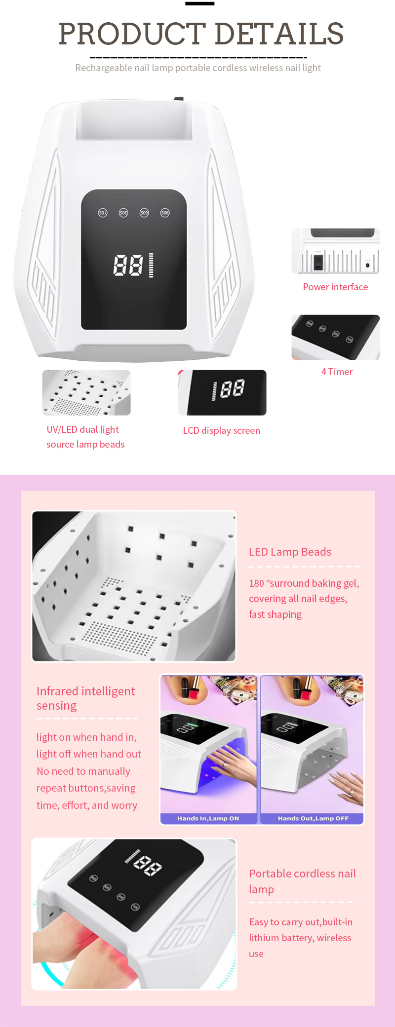 रिचार्जेबल नेल पोलिश लैंप प्रोफेशनल वर्जन 120W प्रोडक्ट उपस्थिति में एक नाली डिज़ाइन है, खांचे में हैंडल को पोर्टेबल हैंडल रोल के रूप में इस्तेमाल किया जा सकता है, जिससे इसे ले जाने और डालने के लिए अधिक सुविधाजनक हो जाता है। यह संभाल के नुकसान से भी आसानी से टूट जाता है और ढीला हो जाता है।